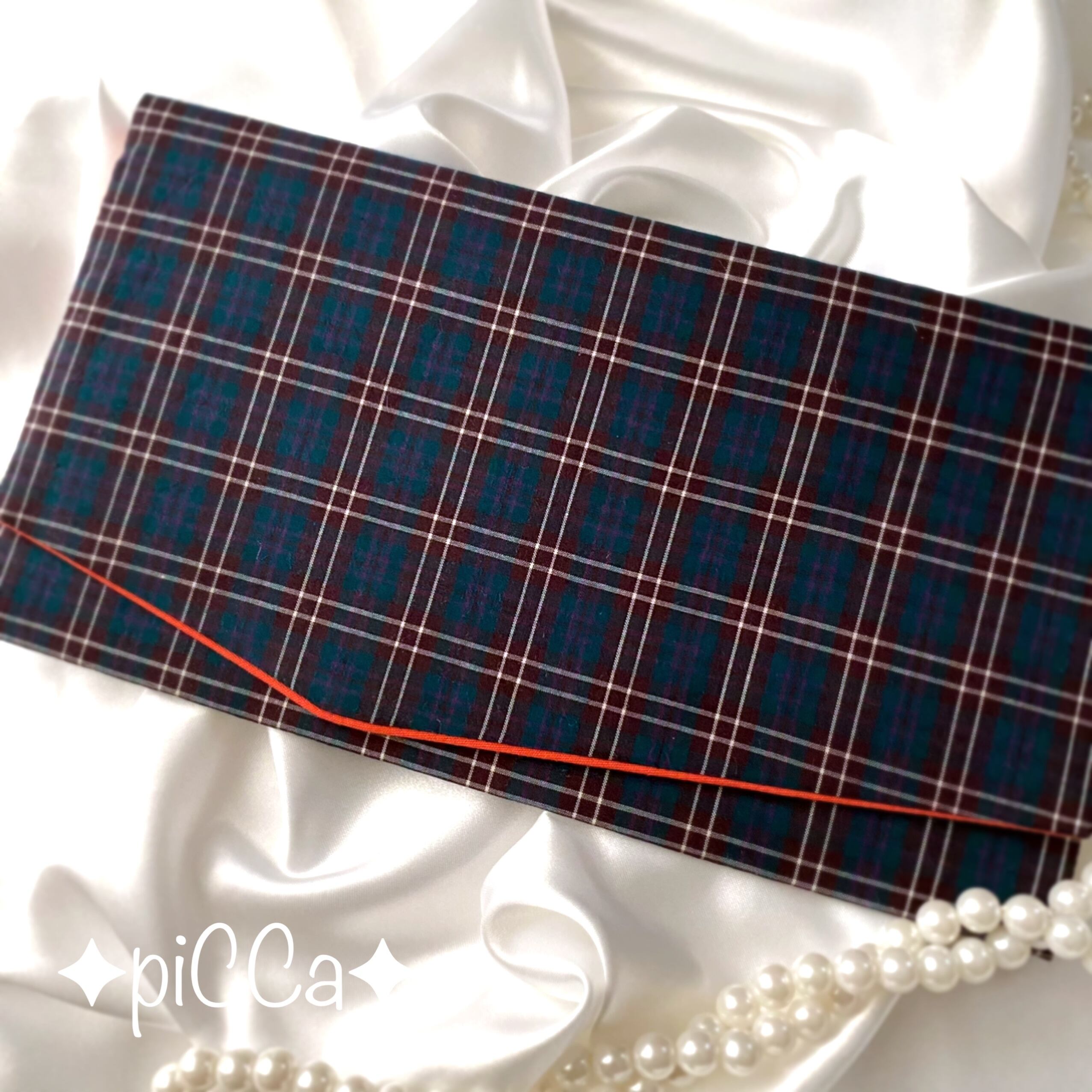 myフクサ 紫グリーンチェック柄×コーラルピンク 普通サイズ袱紗