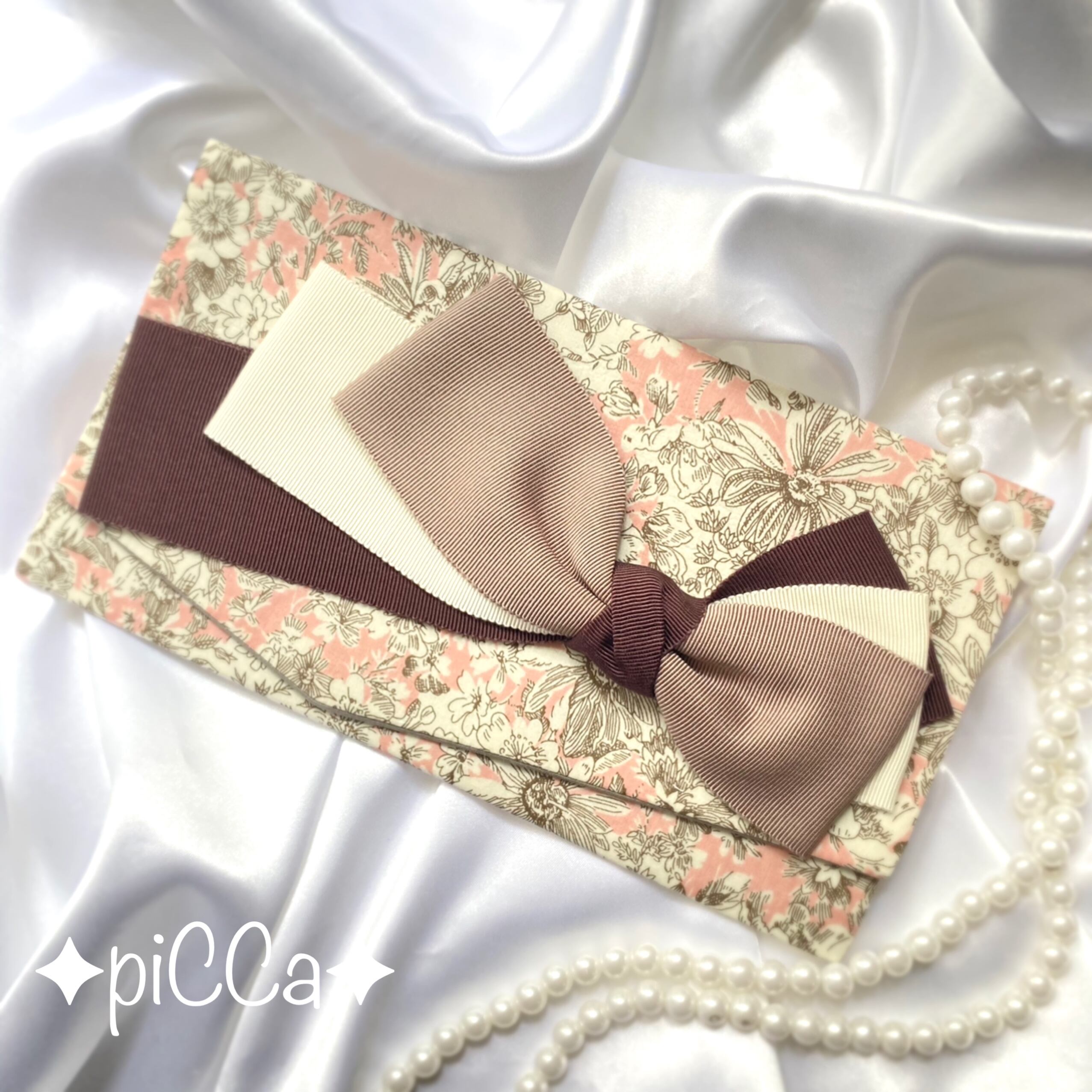 myフクサ リバティさくらピンク×グレージュ Bigリボン 普通サイズ袱紗