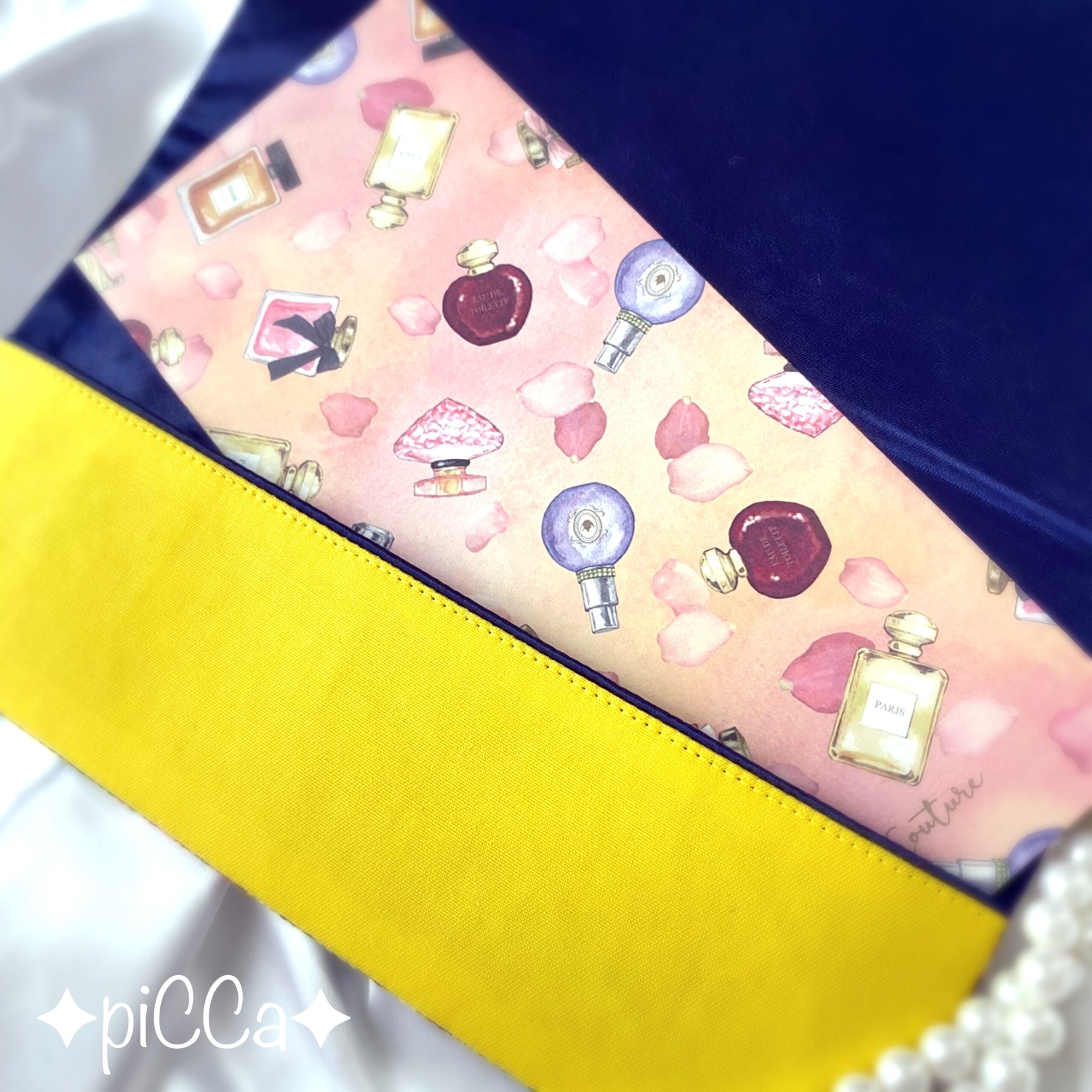 ◆myフクサ リバティビジュー柄×イエロー×ネイビー 普通サイズ袱紗