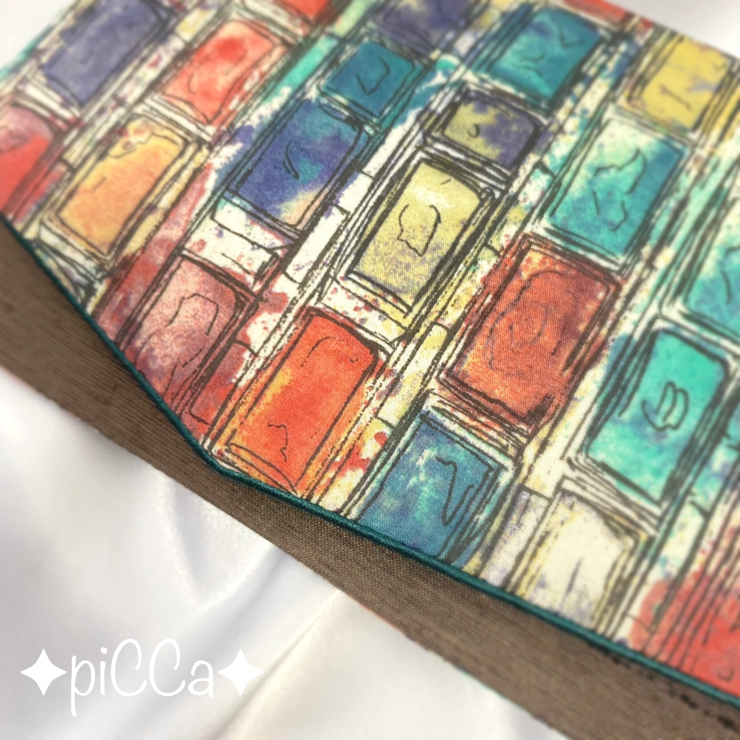 表生地はリバティ生地で水彩パレットのようなカラフルな柄。