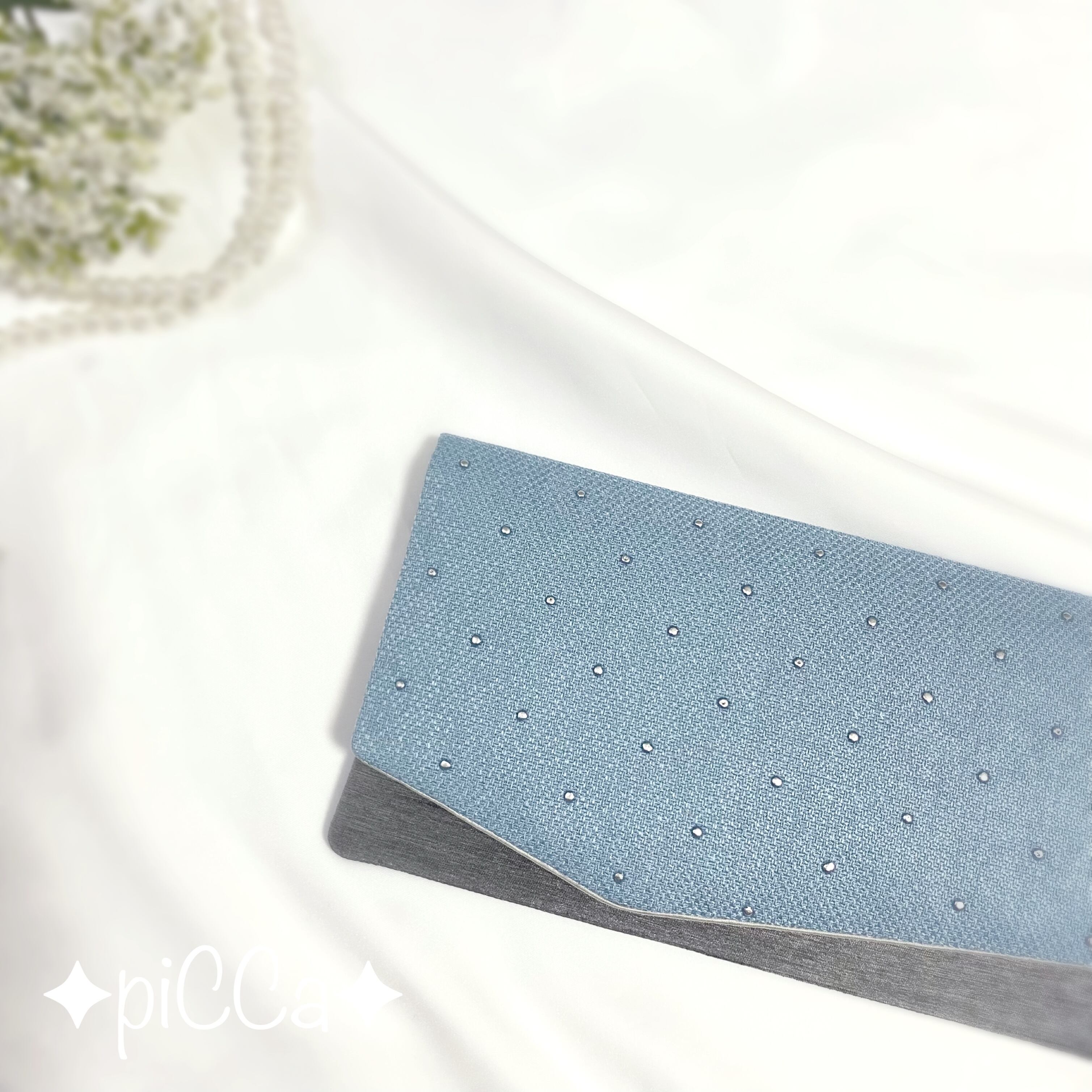 爽やかで上品な水色のリネン風生地に、立体感のあるシルバーのドットが散りばめられた、高級感のあるデザインが魅力。